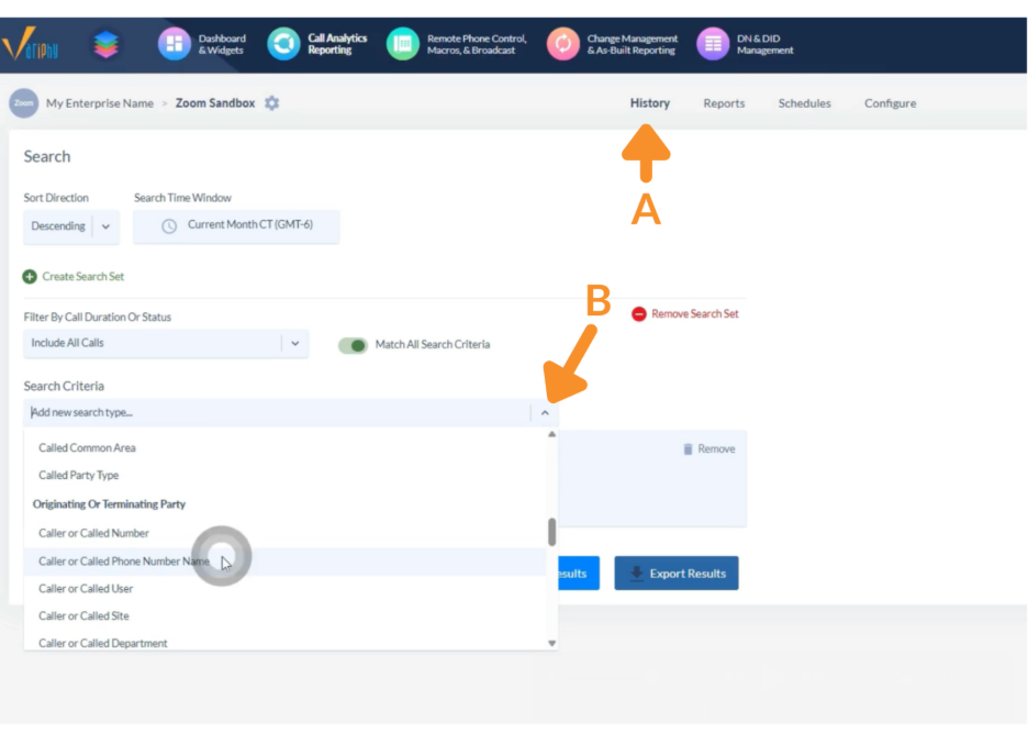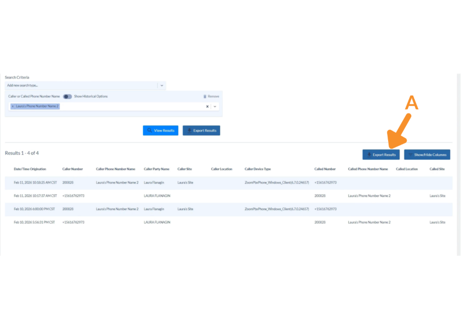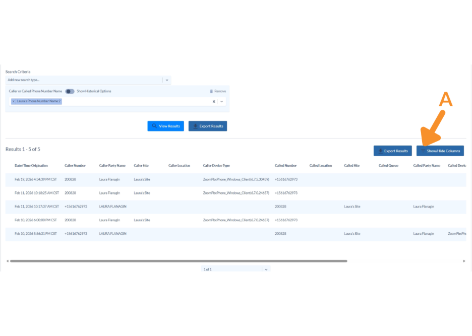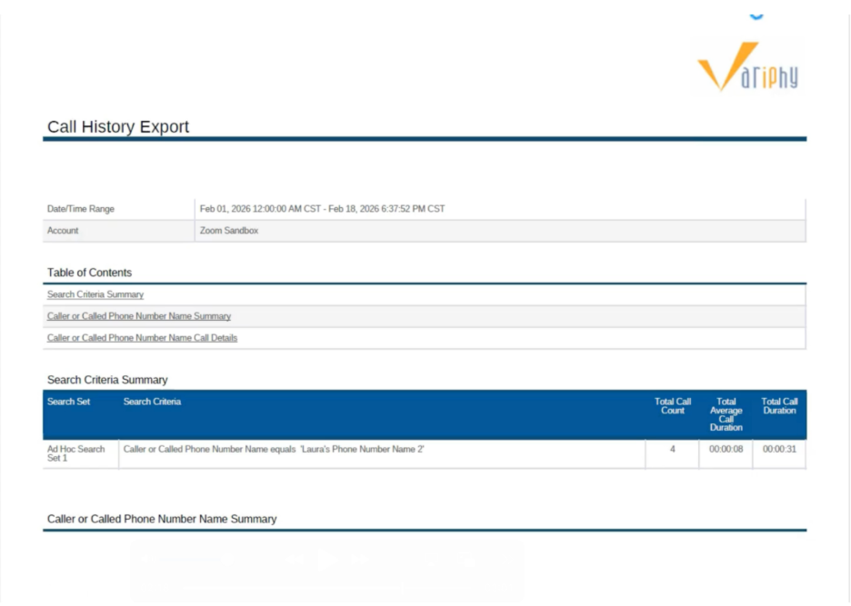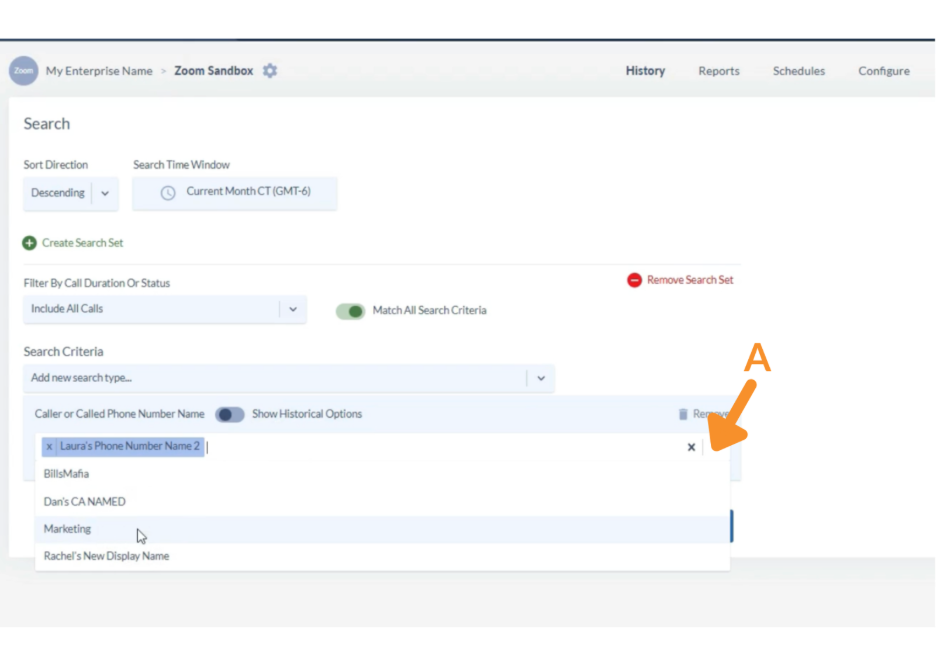 - Search for calls tied to a specific Zoom Phone display name (Phone Number Name).