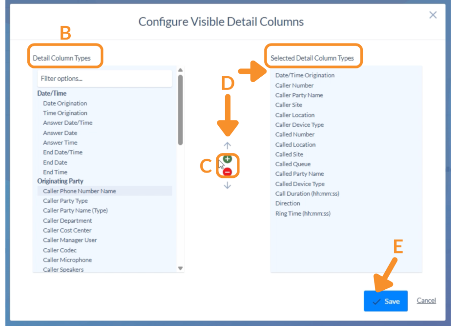 C. Click the green + button to add it to the Selected Detail Column Type list. To remove a column, select it from the Selected Detail Column Type list and click the red – button.
